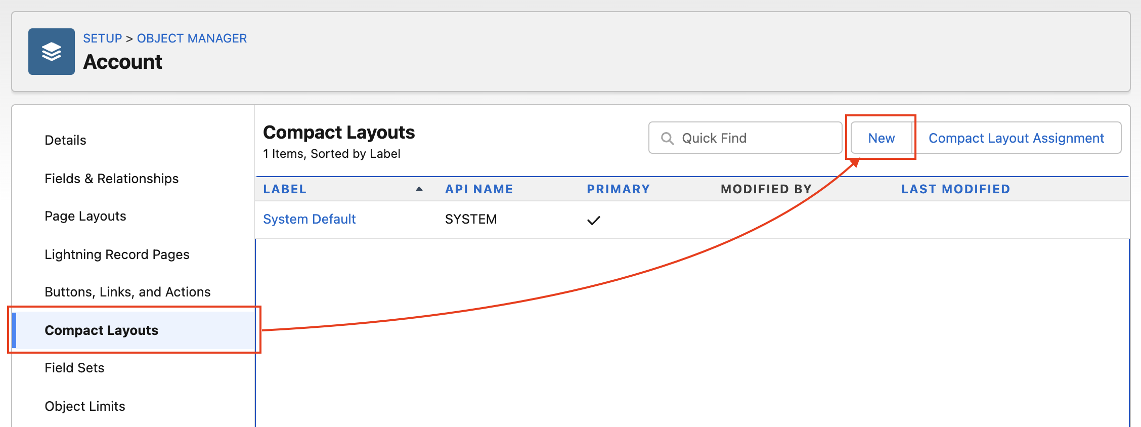 Compact Layout 설정을 원하는 오브젝트 선택한 후 Compact Layouts 메뉴를 선택 > [New] 버튼을 클릭합니다.