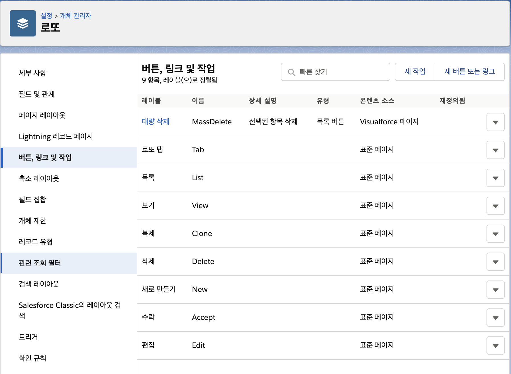 3. Salesforce Classic의 레이아웃 검색 메뉴에서 목록 보기의 편집을 클릭합니다.