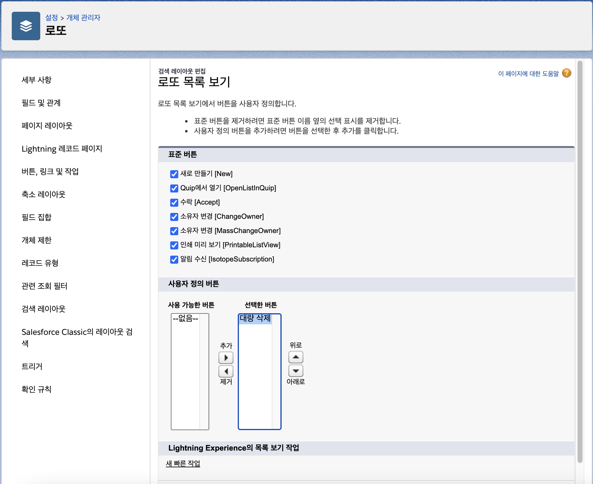 4. 사용자 정의 버튼 섹션에서 앞에서 추가한 대량 삭제 버튼을 선택한 버튼 쪽으로 옮기고 저장을 합니다.