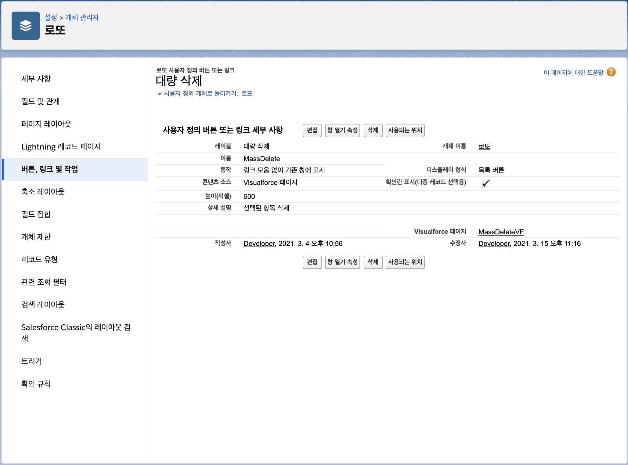 1. 설정 > 개체 관리자 에서 해당 오브젝트(Lotto__c)의 버튼, 링크 및 작업 메뉴에서 새 버튼 또는 링크를 클릭하여 아래와 같이 등록 합니다.