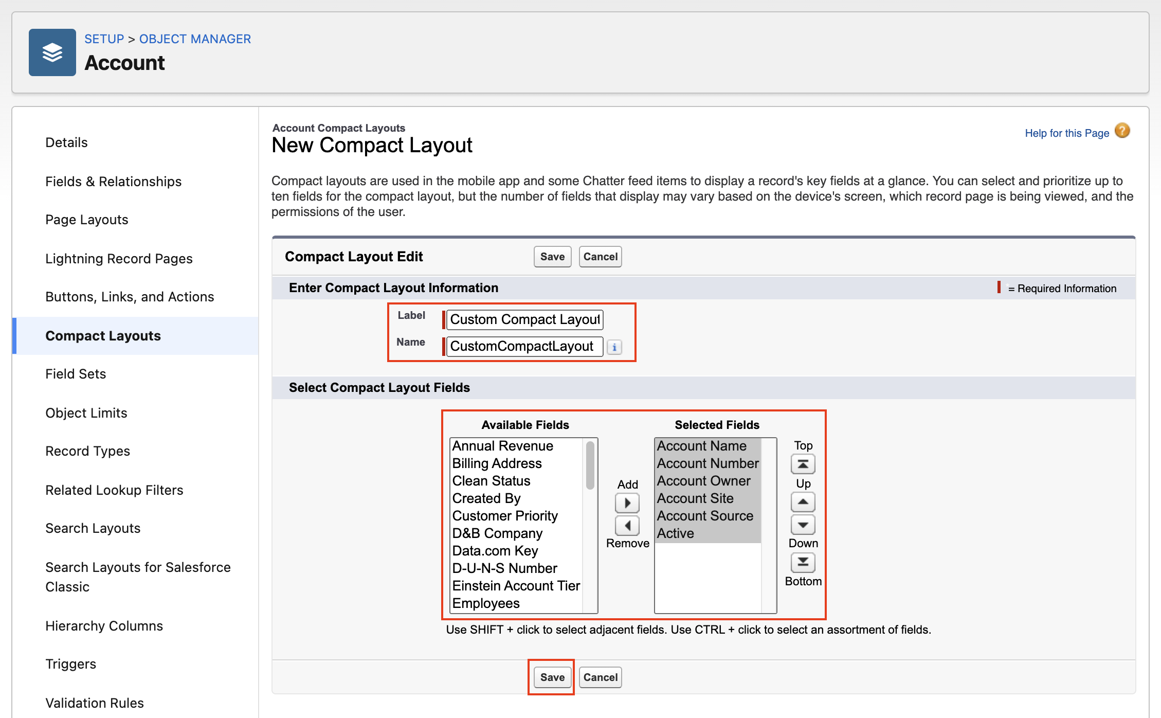 Label, Name 필드를 입력하고, Compact Layout에 표시하고자 할 필드를 선택 > [Save] 버튼을 클릭합니다.