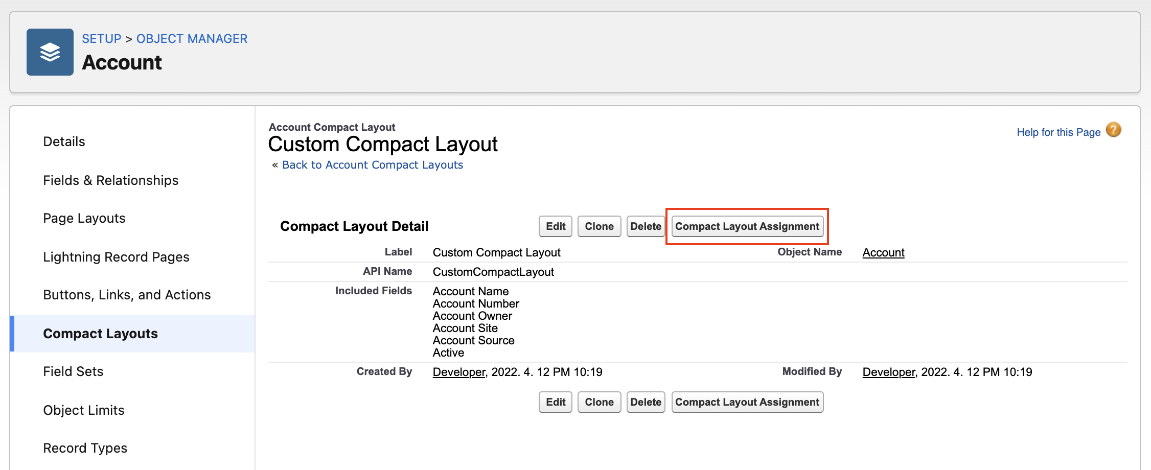 새로운 Compact Layout 이 생성 되고 [Compact Layout Assignment] 버튼을 클릭합니다.
