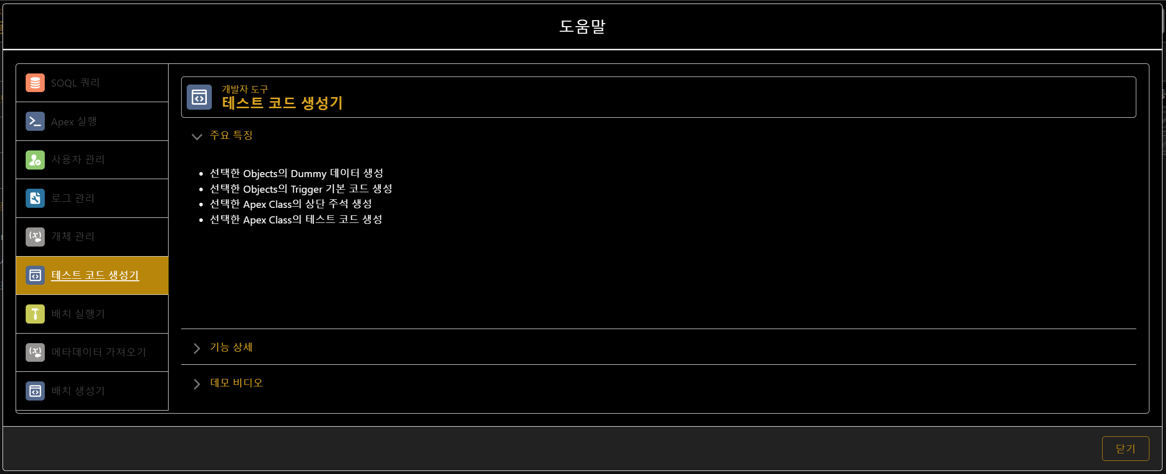 - 선택한 Apex Class의 테스트 코드 생성