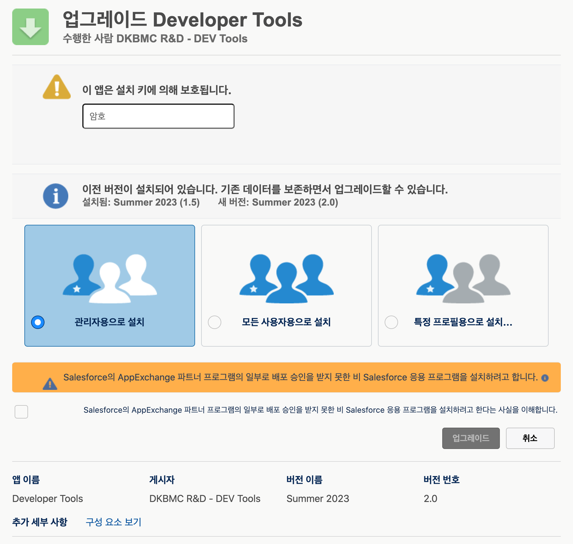 개별 ORG 환경 : https://[ORG Domain]/packaging/installPackage.apexp?p0=04t2v0000076EQM
