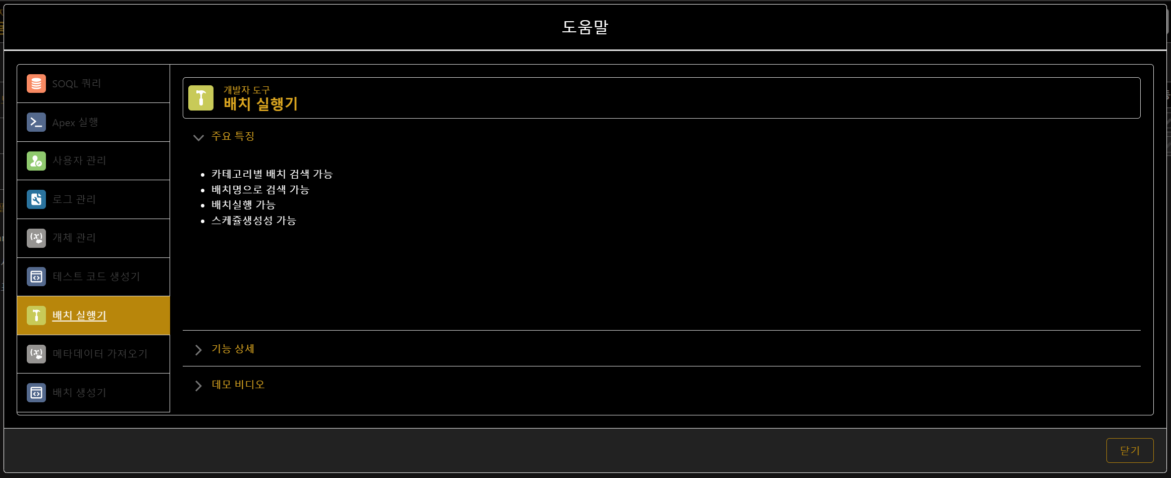 각 탭별로 ? (도움말) 버튼을 통해 주요 특징과 기능 상세에 대한 설명 하였습니다.