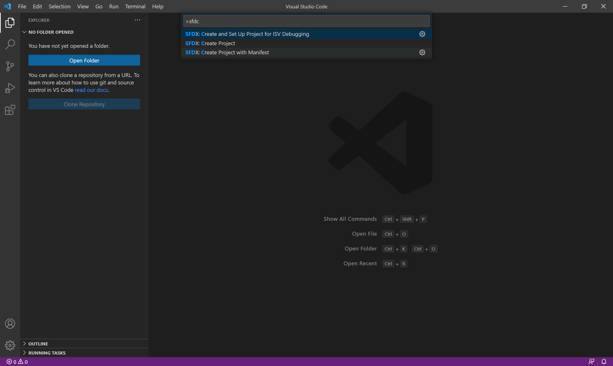 3. Ctrl + Shift + P 를 눌러 SFDX를 검색 했을 때 아래와 같은 명령어들이 보이면 사용 준비가 된 것입니다.