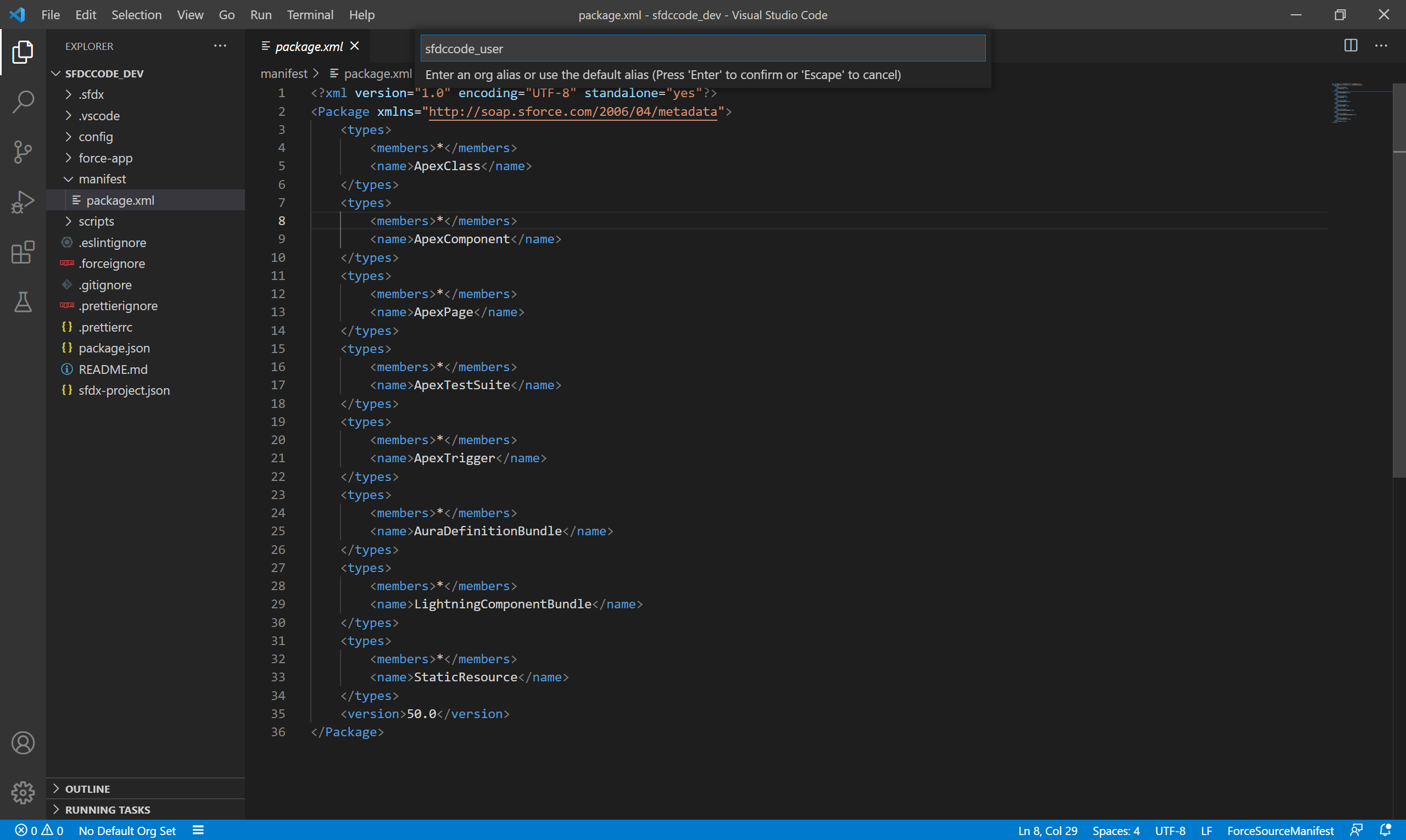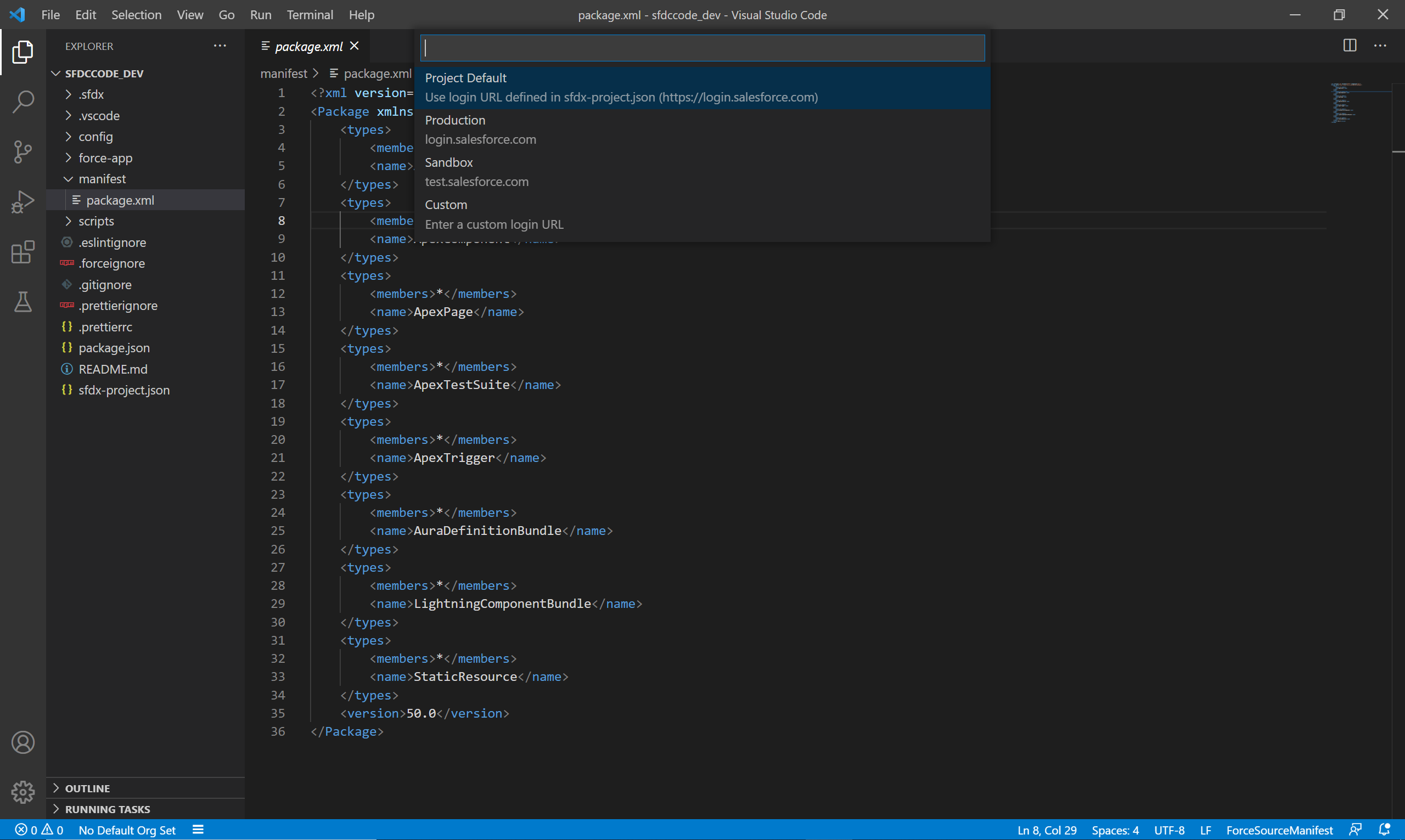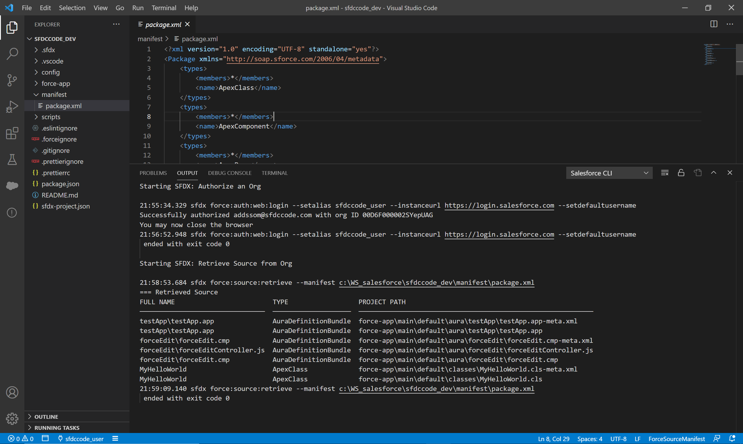프로젝트 폴더 > manifest > package.xml를 열고, 마우스 우클릭 후 SFDX: Retrieve Source in Manifest from Org를 선택합니다. 이후 다운로드가 진행 됩니다.