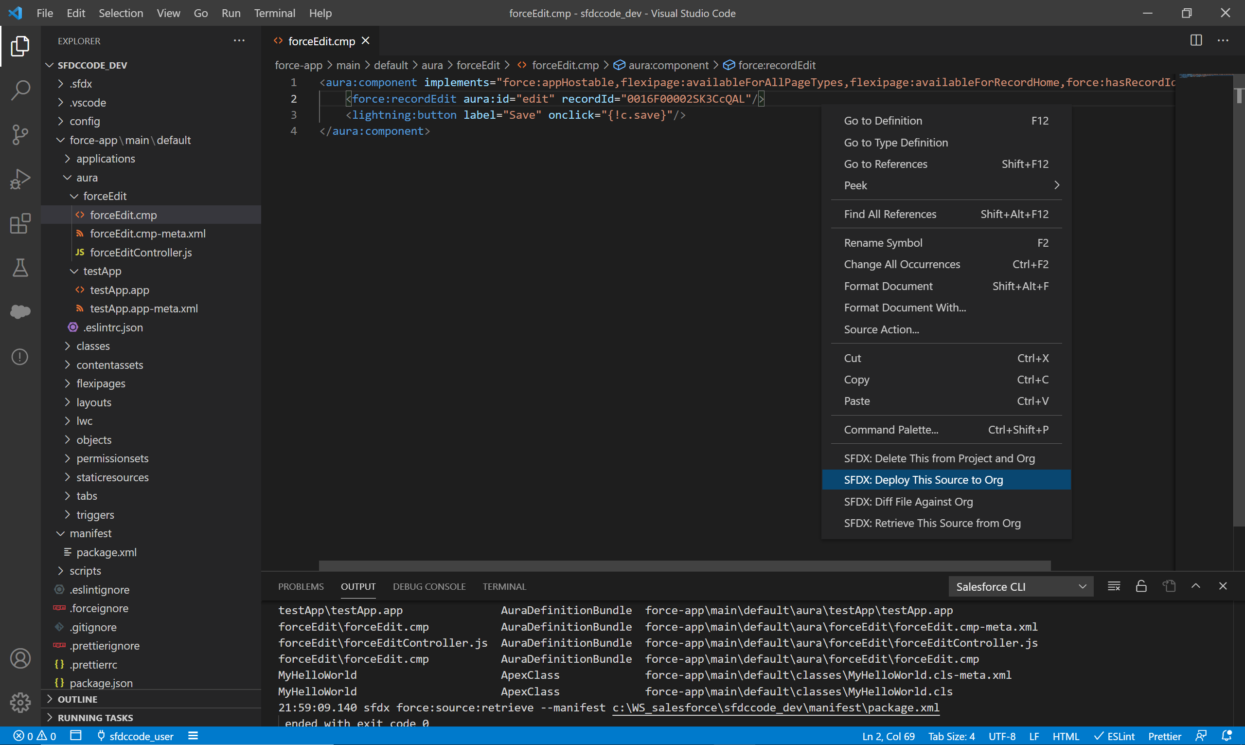 13. 이제 수정이 필요한 코드를 열어서 수정 및 저장을 한 후 마우스 우클릭 후 SFDX: Deploy This Source to Org를 선택합니다. 연결된 서버로 Deploy가 진행 됩니다.