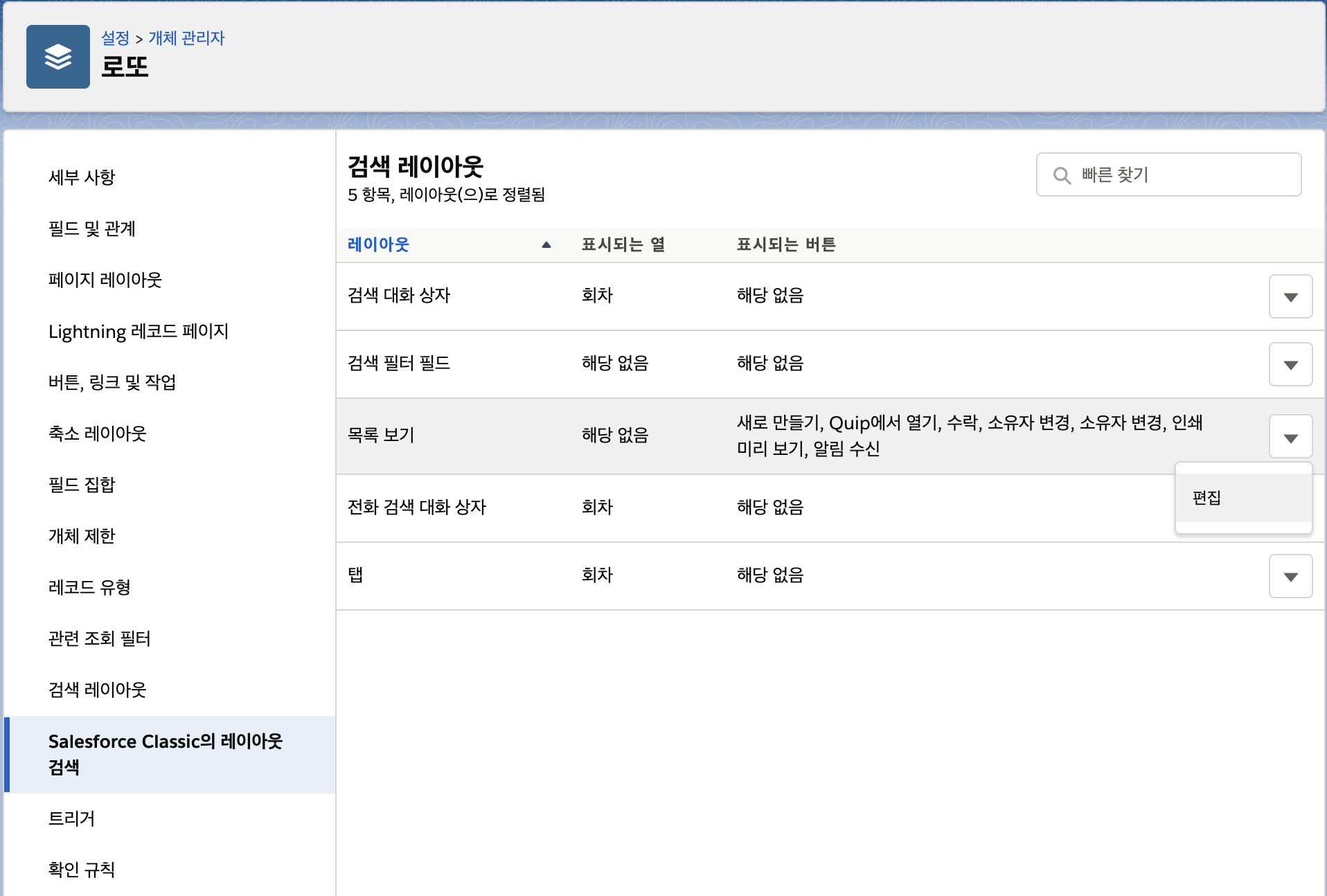 3. Salesforce Classic의 레이아웃 검색 메뉴에서 목록 보기의 편집을 클릭합니다.